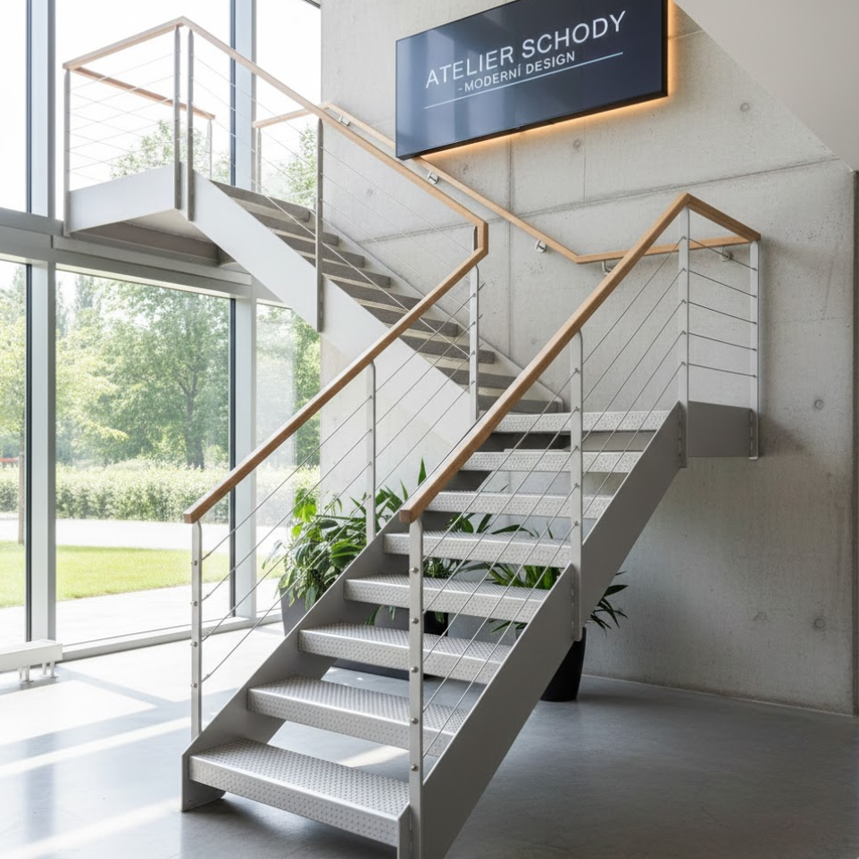 Konstrukce schodiště s podestou je navržena tak, aby byla pevná, stabilní a odolná, přitom elegantní:
